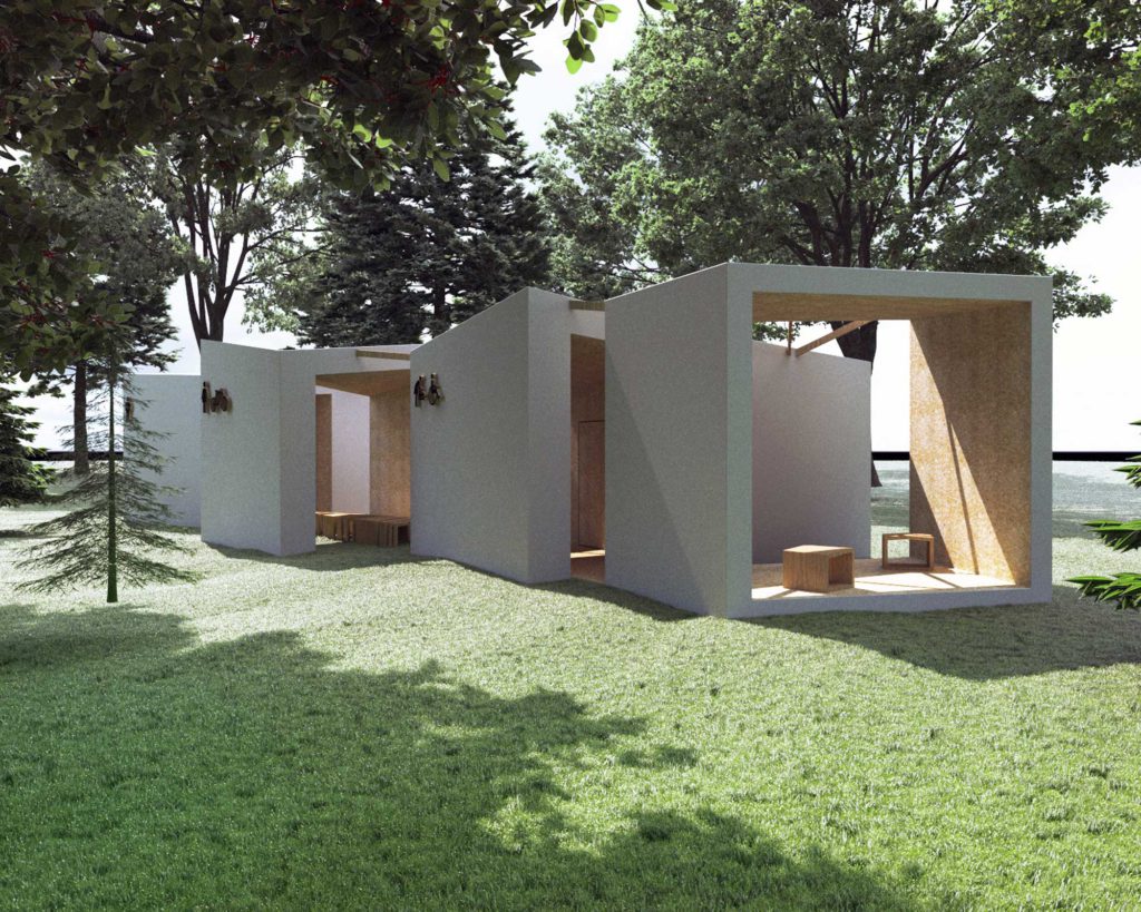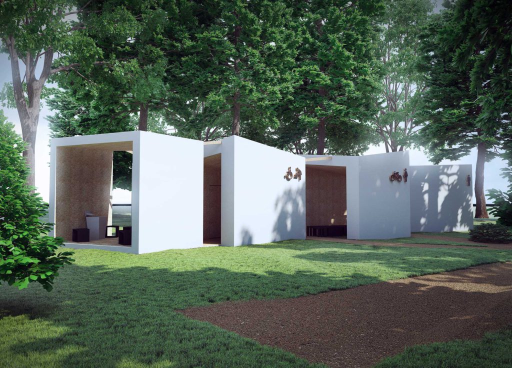 Głównym założeniem przy projektowaniu budynku było stworzenie innowacyjnego obiektu, który odpowiadałaby nowoczesnym standardom i który będzie służył całej społeczności lokalnej. Będzie on podzielony na cztery strefy, każda strefa to osobna bryła. Dzięki temu obiekt nie tylko staje się czytelny dla użytkownika, ale pozwala również stworzyć integralną część z parkiem. Najbardziej widoczną bryłą jest bryła, która tworzy przestrzeń toalety damskiej oraz zadaszenie dla rowerów z miejscem do siedzenia. Kolejną bryłę stanowi toaleta męska z pomieszczeniem gospodarczym, następna toaleta dla niepełnosprawnych oraz przewijak. Ostatnią bryłą, otwierającą się na park, jest zadaszenie ze źródełkiem. Dzięki takiej strukturze między budynki można wprowadzić zieleń, a cały obiekt współgra ze sobą. Można go też w razie potrzeby rozbudować o dodatkowe funkcję takie jak np. szatnia, natryski itp. , nie zaburzając przy tym architektonicznego charakteru bryły.